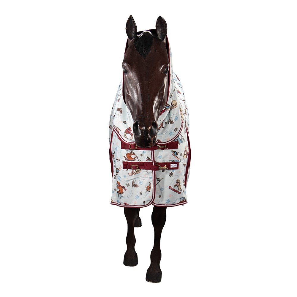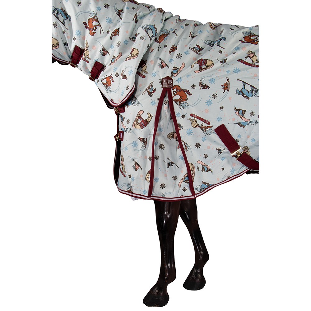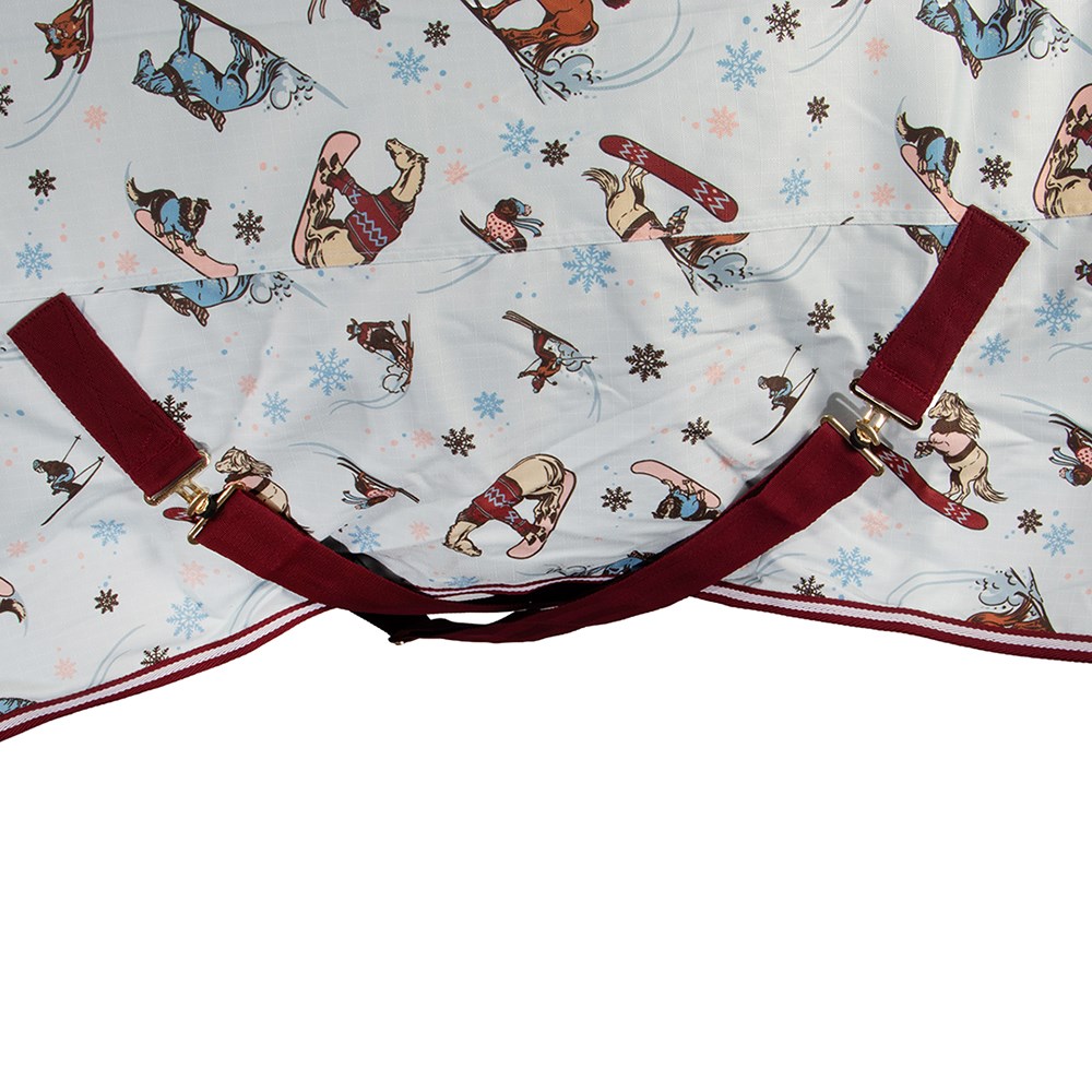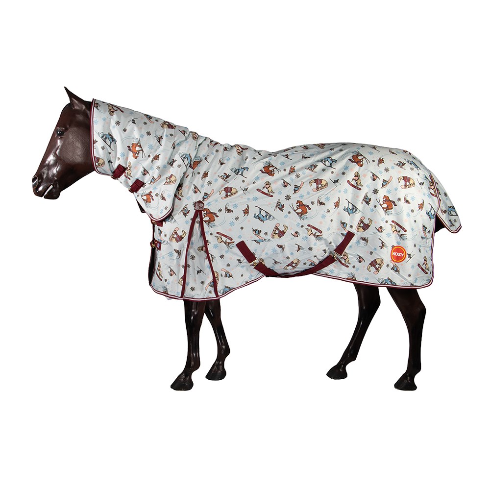 New 1200 Denier 200 gram fill Kozy winter rug available in an adorable limited edition 'Ski' print. Matching three toned binding and rubberised shoulder gusset patch for added strength. This winter combo features a seamless ripstop, waterproof outer with double chest straps, adjustable T-Lock crossover surcingles, and adjustable leg straps combined with high quality hardware. This combo is a great choice for those wanting a warm and durable option for winter.