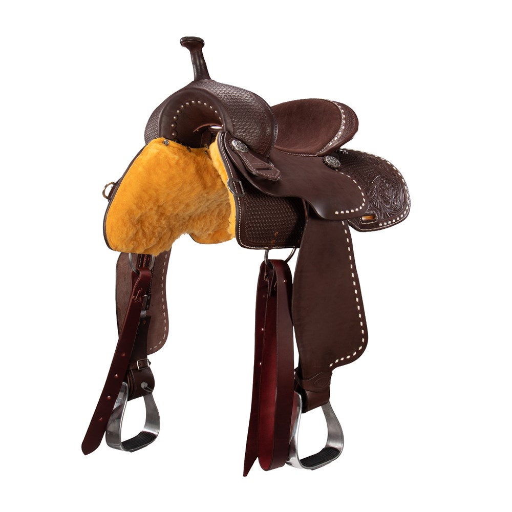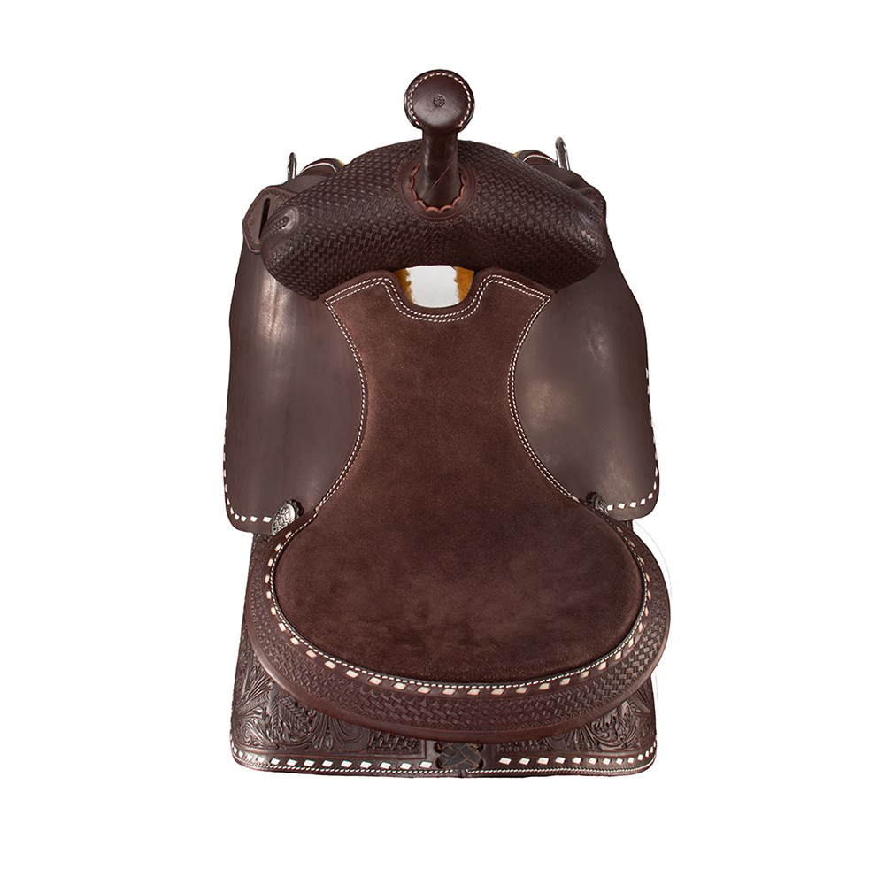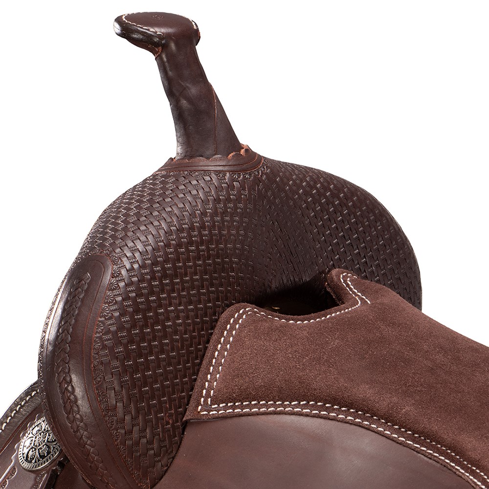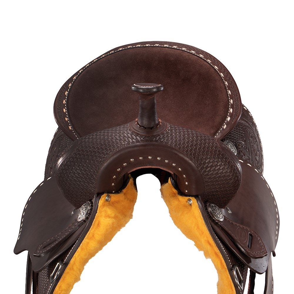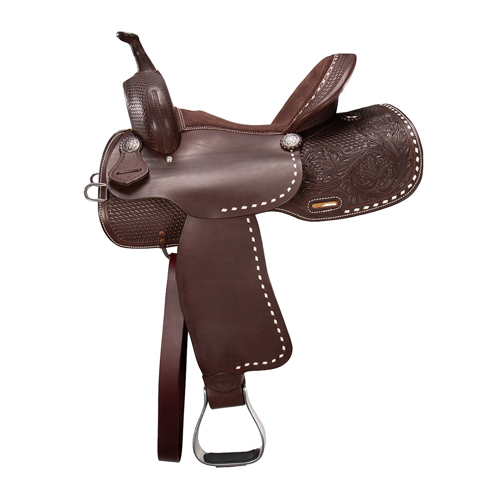 Crafted for both style and performance, this saddle combines classic craftsmanship with eye-catching detail. Featuring a rough out suede seat, the saddle is beautifully finished with intricate tooling, showcasing a mix of floral and basketweave patterns that add depth, texture, and a true western aesthetic. Every detail has been carefully considered, from the clean stitching lines to the rich, chocolate-toned leather. Finished with decorative Conchos, this saddle delivers a refined, high end look while maintaining durability and practicality.