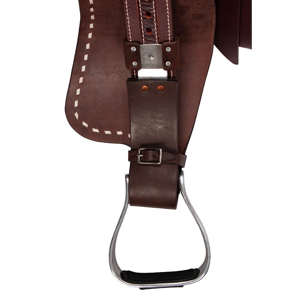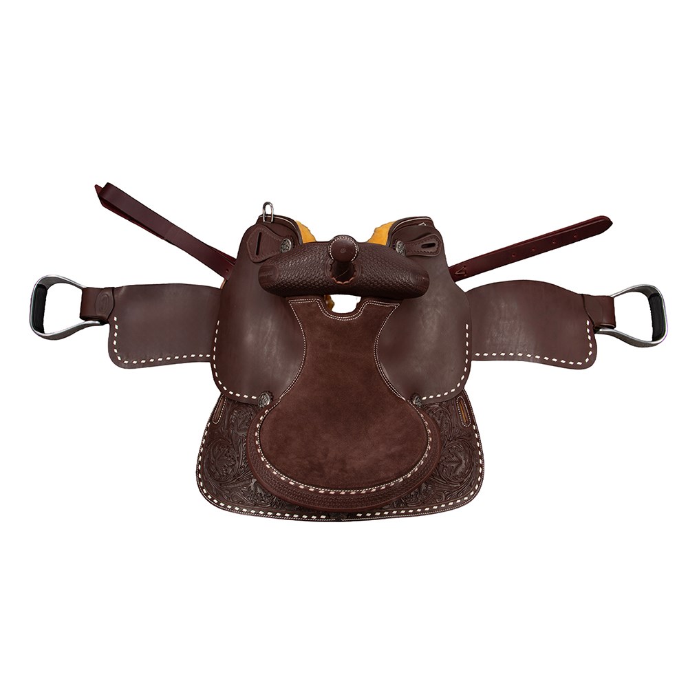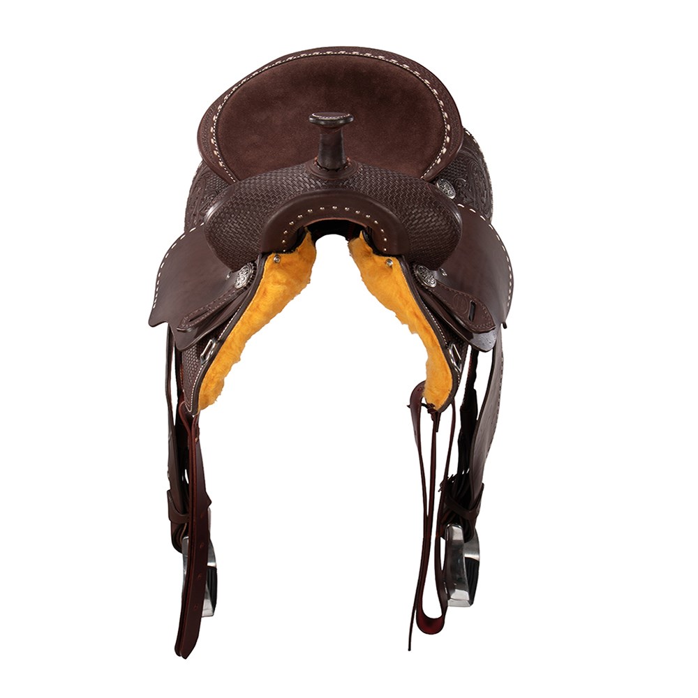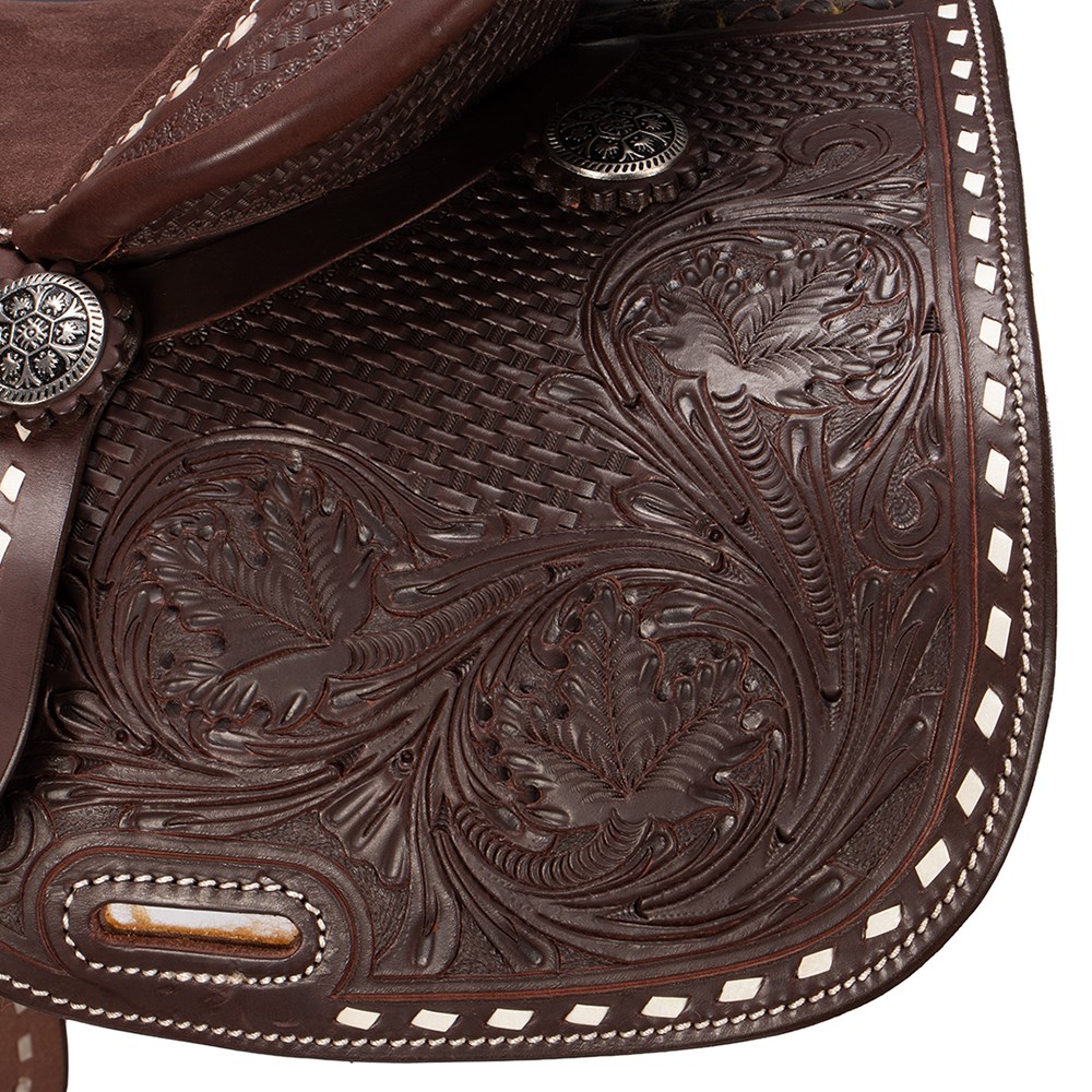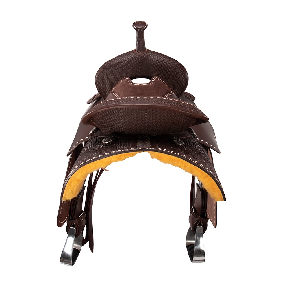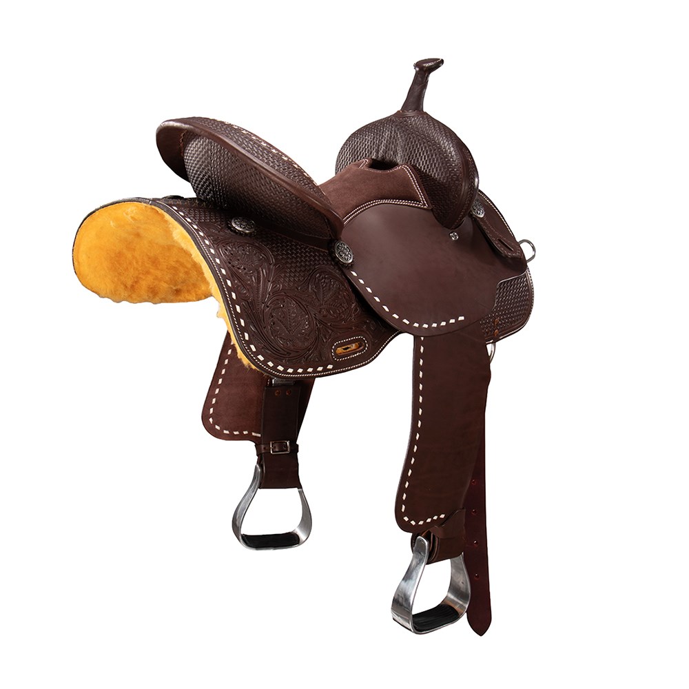 Crafted for both style and performance, this saddle combines classic craftsmanship with eye-catching detail. Featuring a rough out suede seat, the saddle is beautifully finished with intricate tooling, showcasing a mix of floral and basketweave patterns that add depth, texture, and a true western aesthetic. Every detail has been carefully considered, from the clean stitching lines to the rich, chocolate-toned leather. Finished with decorative Conchos, this saddle delivers a refined, high end look while maintaining durability and practicality.