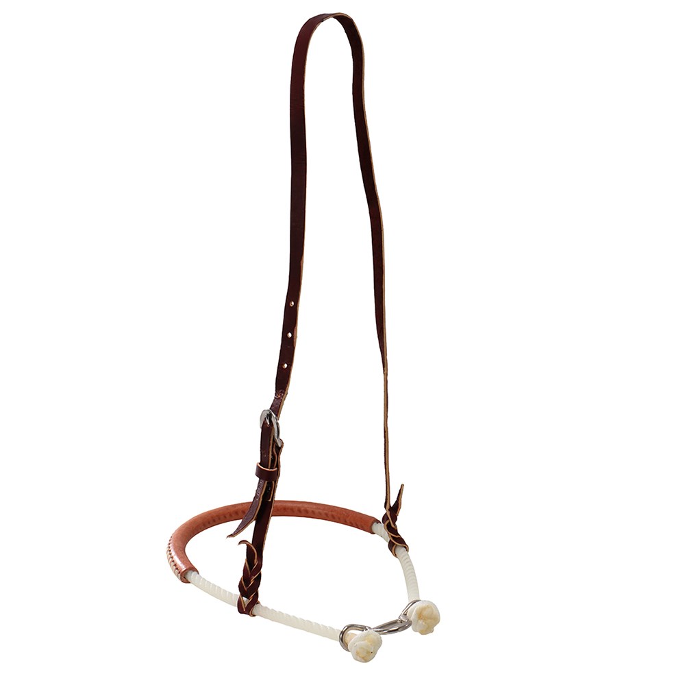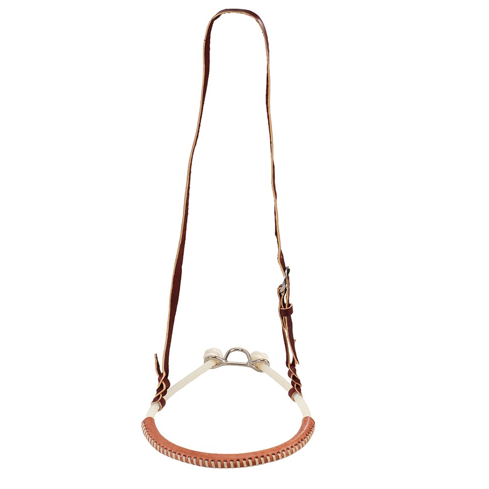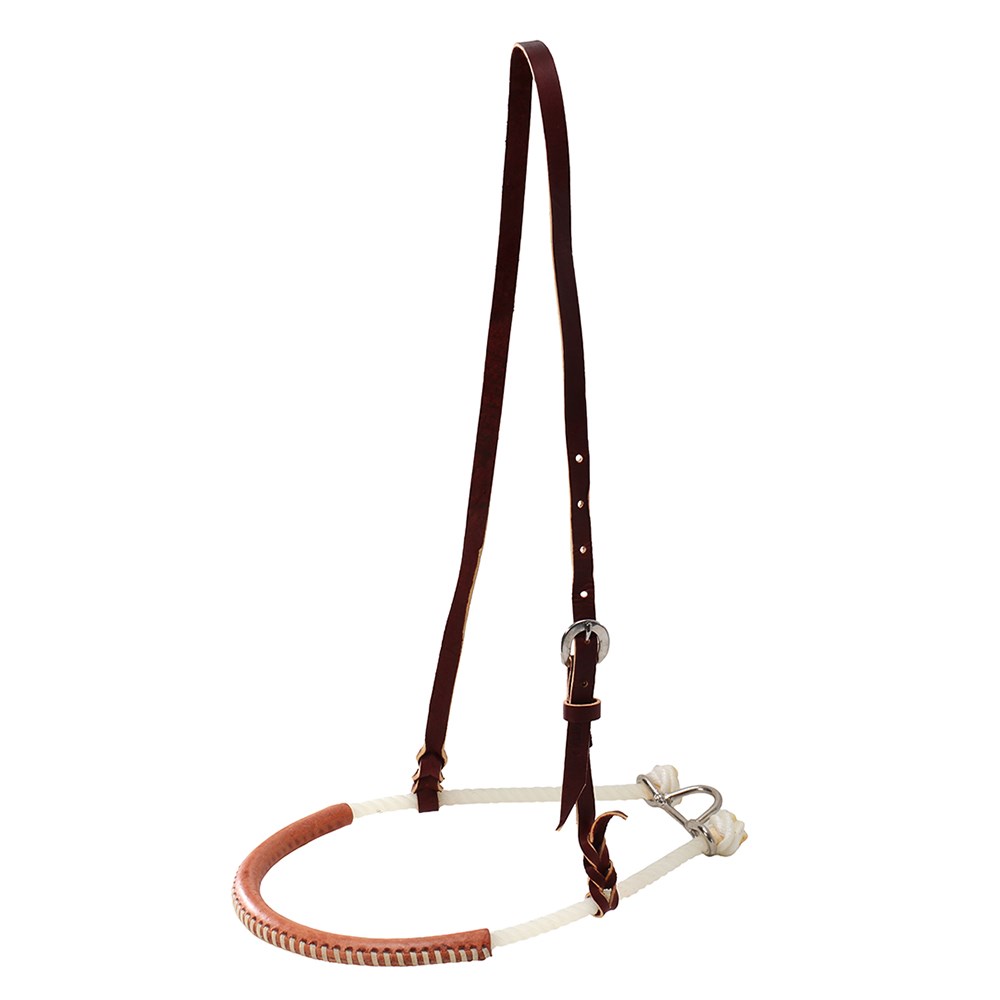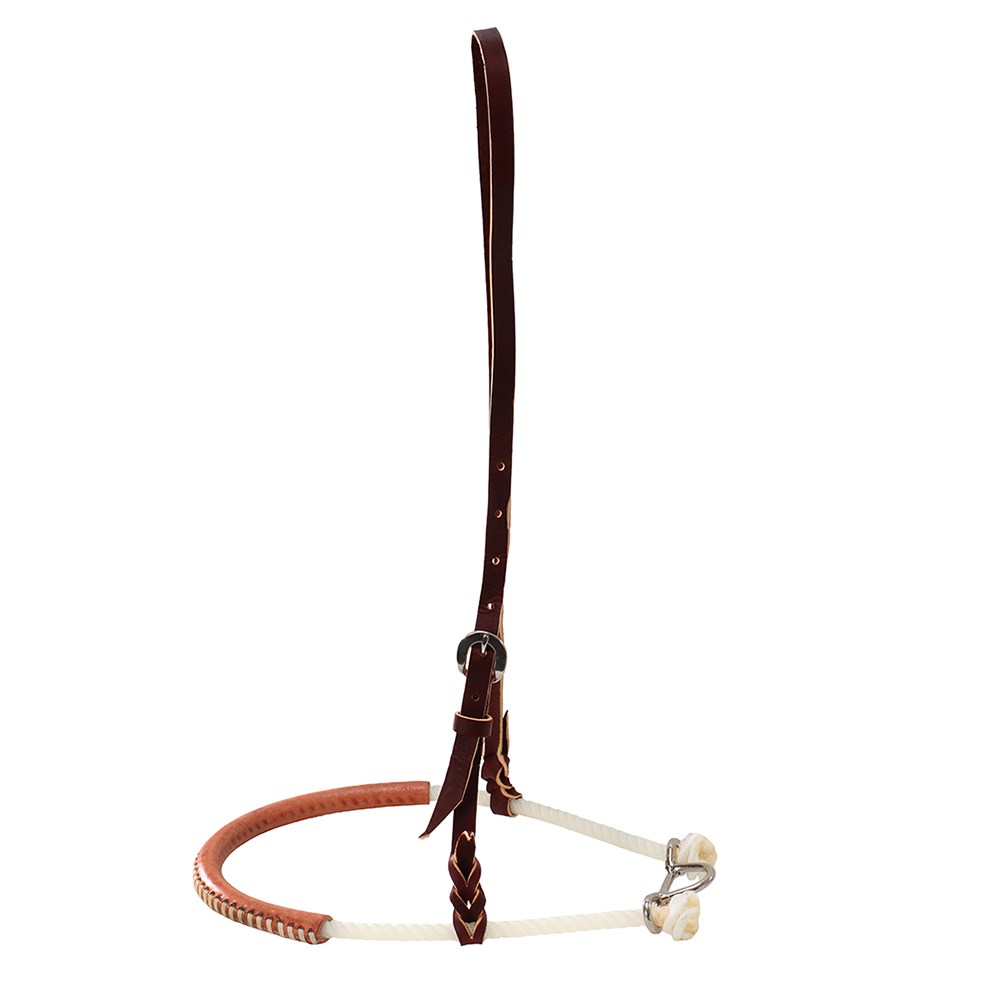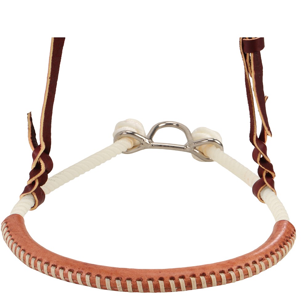 This single rope noseband is handcrafted from medium soft lay lariat rope in ⅜" and covered in russet harness leather with rawhide lacing.