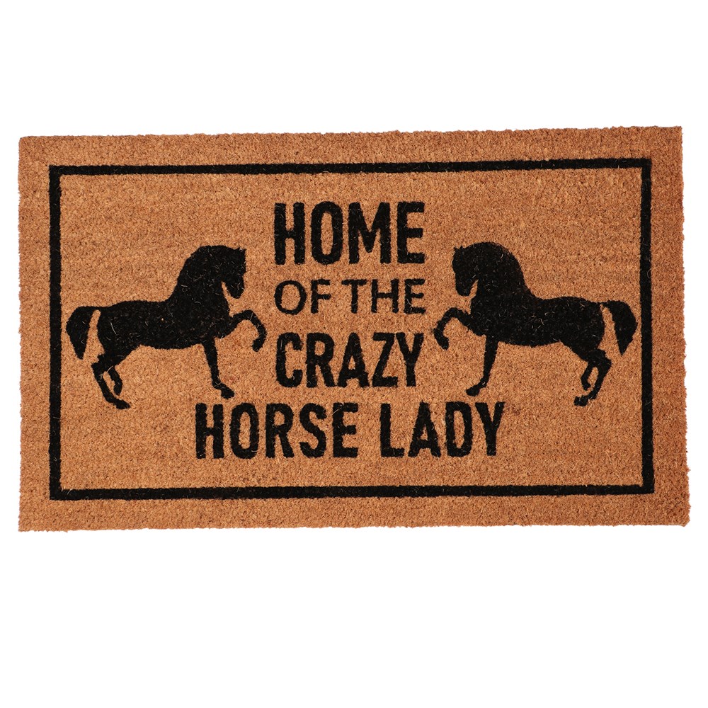 Welcome your family, friends, and neighbours with our vibrant Coir Door Mat featuring slogan "Home of the Crazy Horse Lady" with two prancing horses. Perfect for both exterior and interior use, this mat is tailored specially for equestrian enthusiasts, making it the perfect gift for any horse lover.