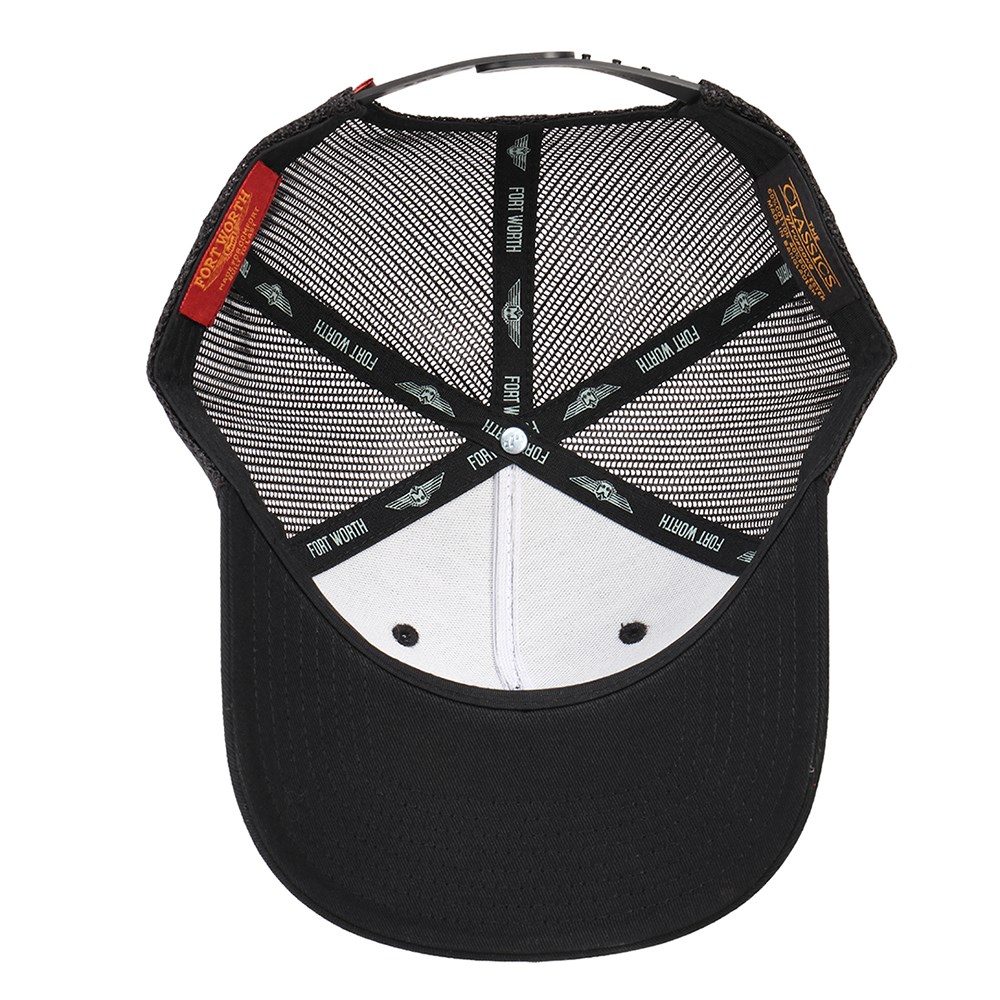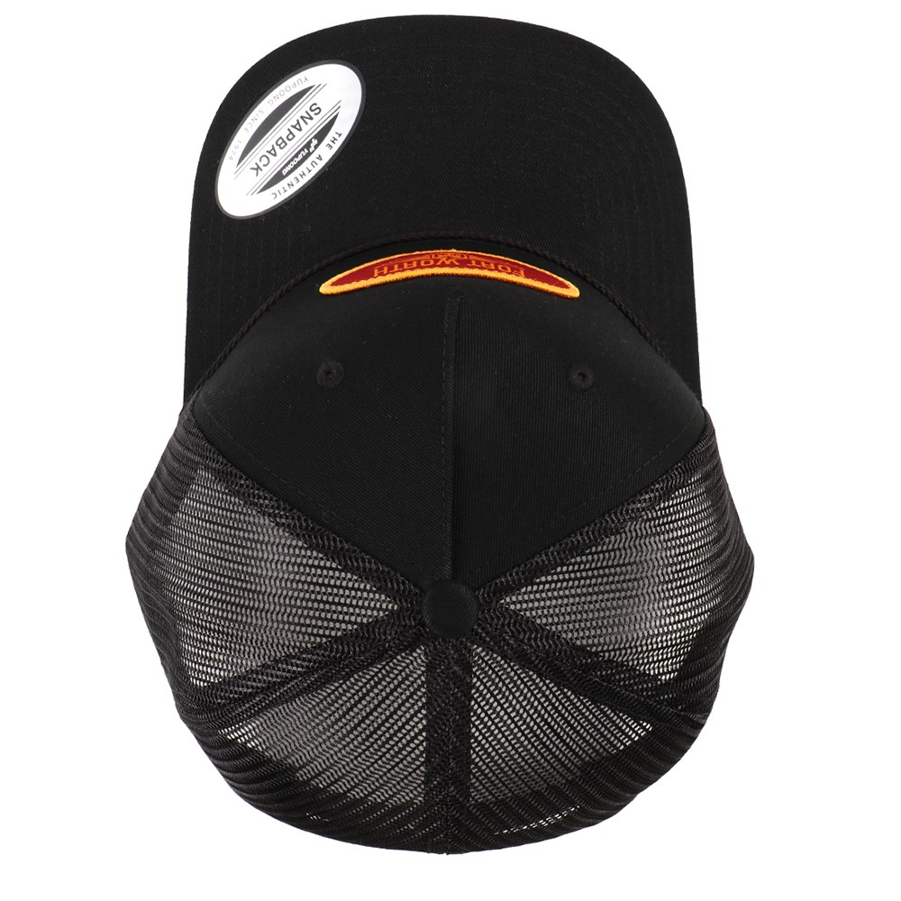 The Fort Worth Patch Trucker Cap in Black is a stylish and comfortable hat featuring a classic trucker design with a black mesh back for breathability and a snapback closure for an adjustable fit. It includes a 2.5-inch sewn-on Fort Worth patch on the front, adding a distinctive touch. The cap is made from a blend of cotton, polyester, and nylon, with a pre-curved bill and a mid-profile crown, making it both practical and fashionable for everyday wear.