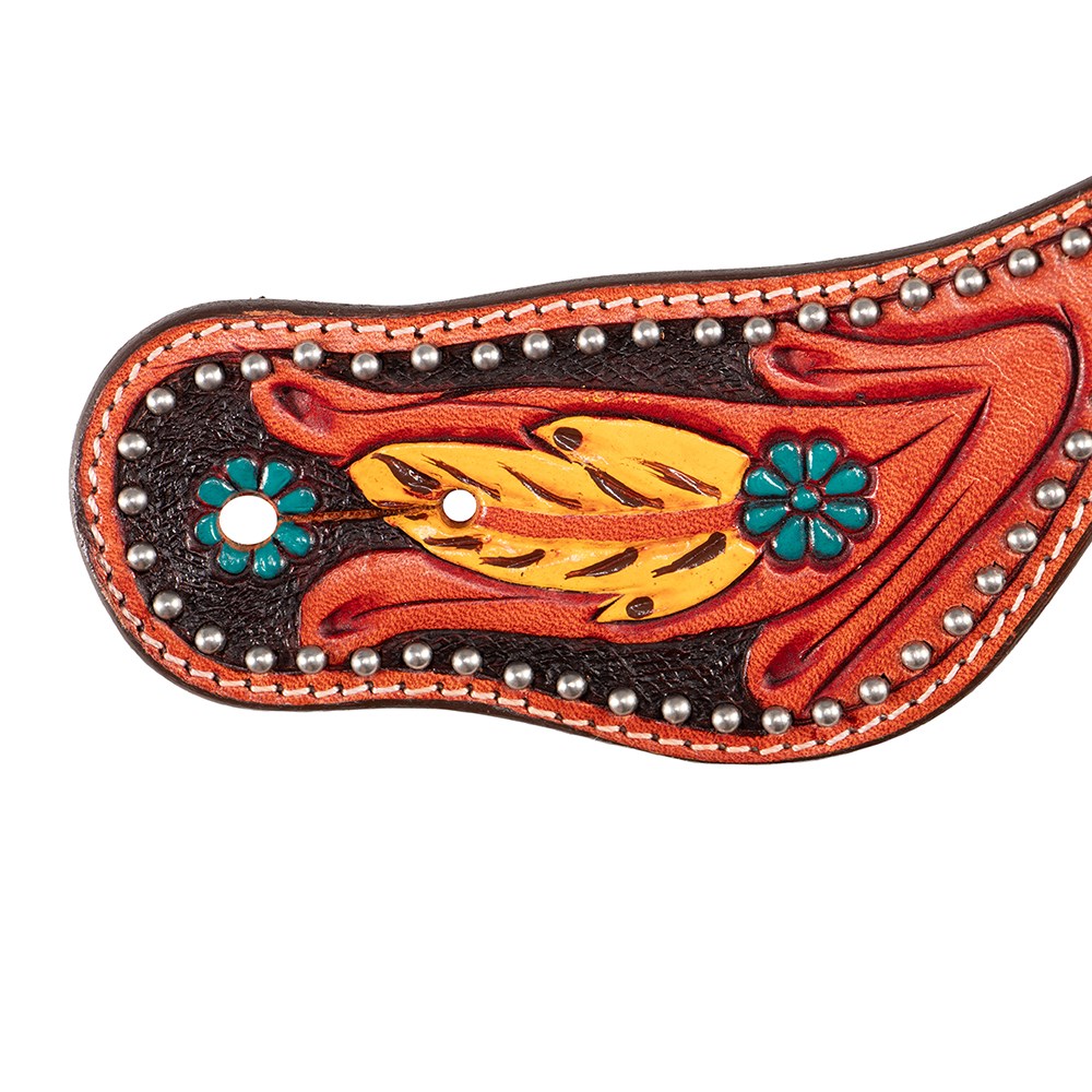 The Cheyenne pattern features painted leather featuring yellow feather and turquoise flower design.
