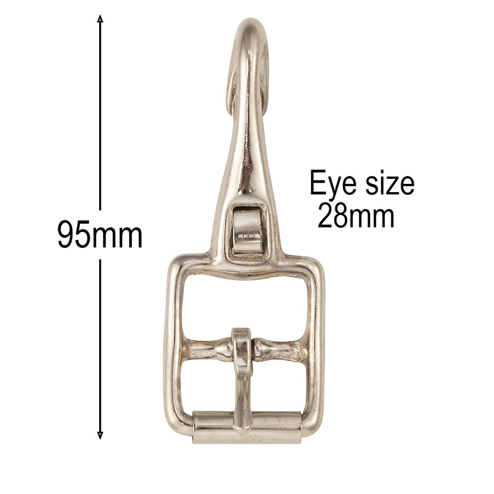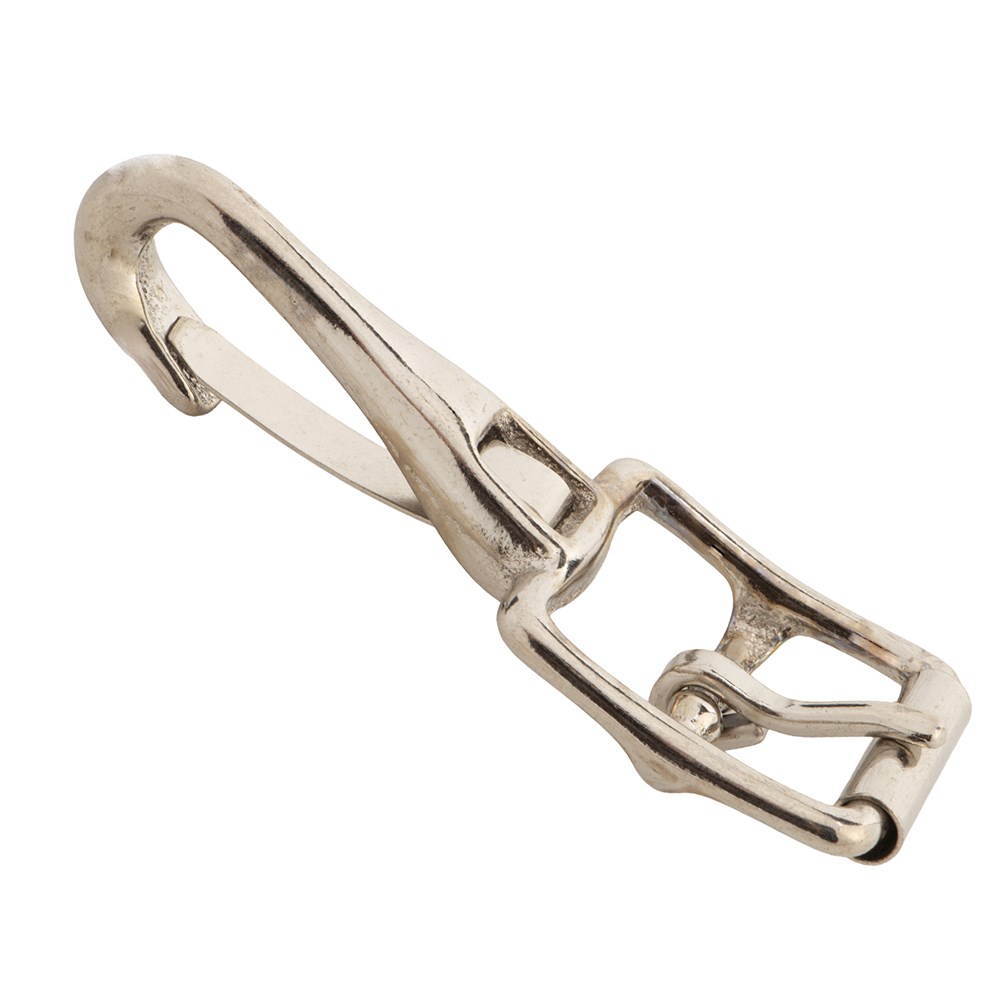 • Spring malleable iron snaphook which has buckle end for attaching to a rug leg strap.