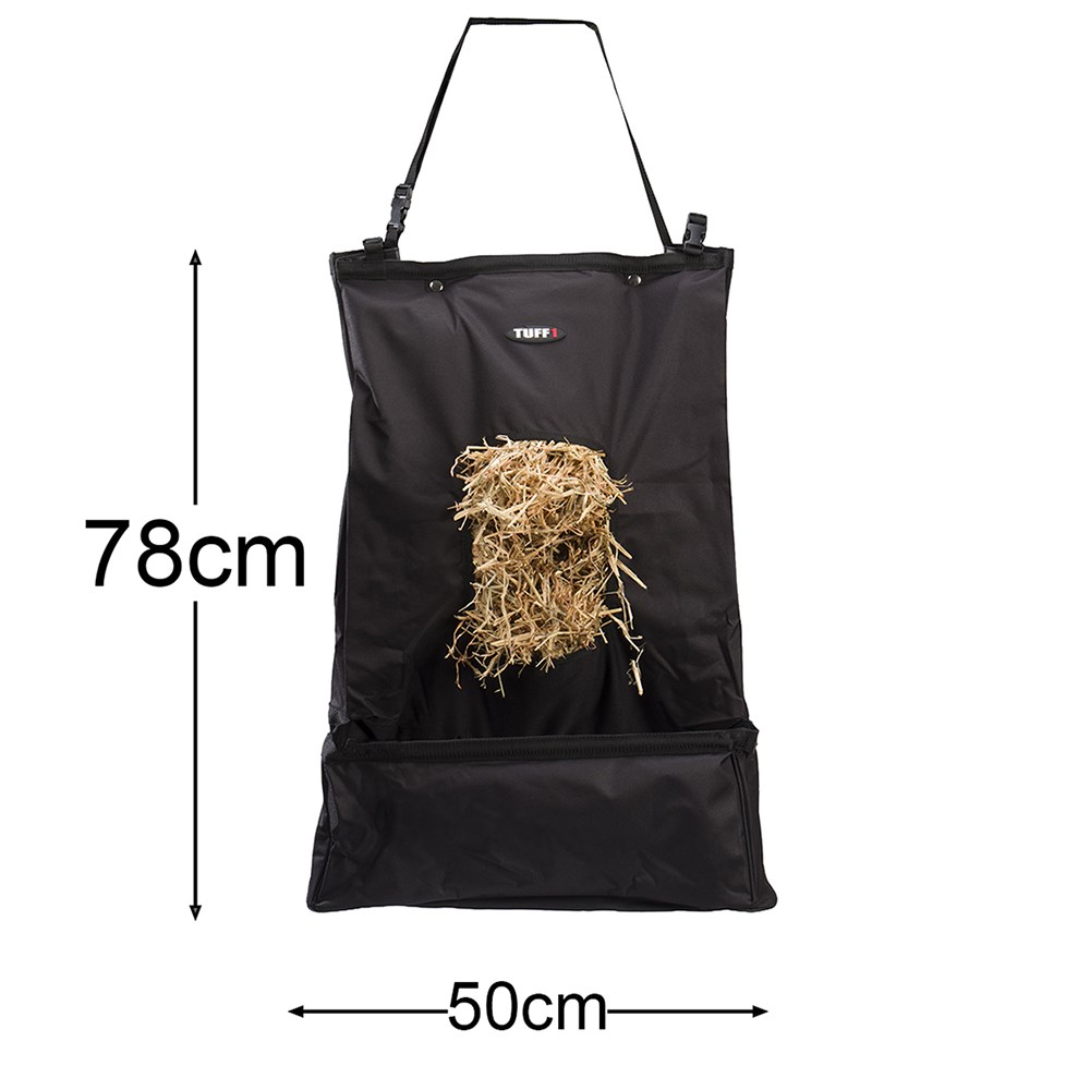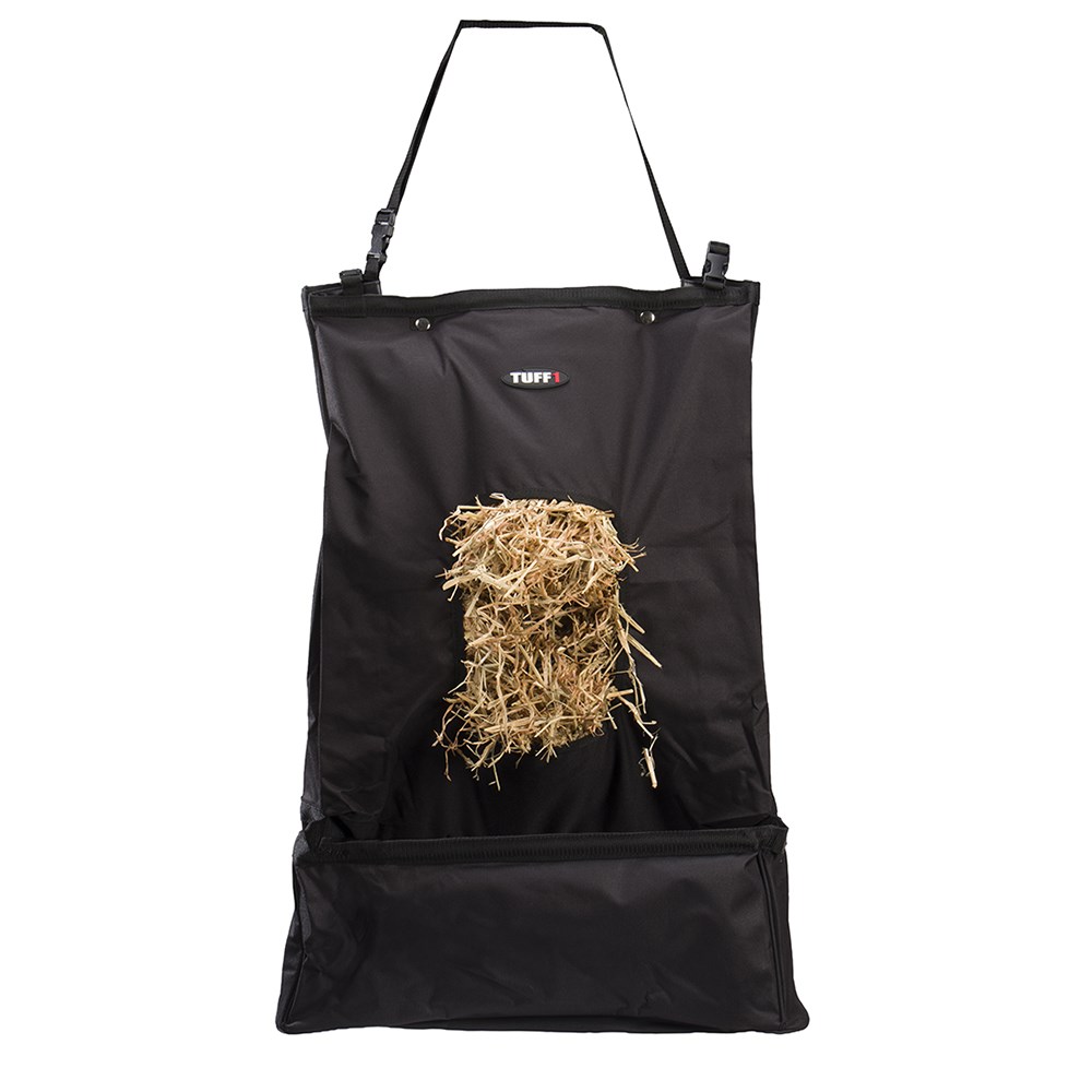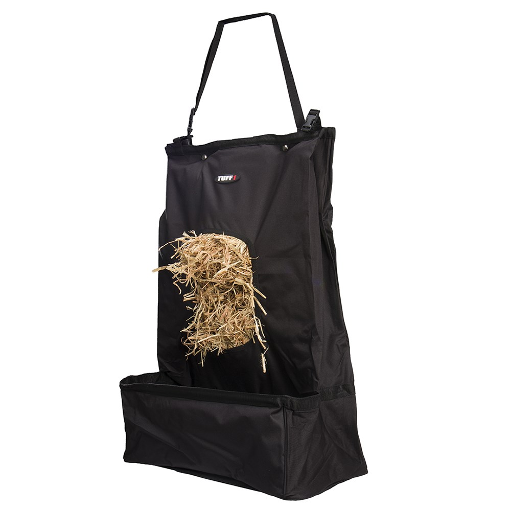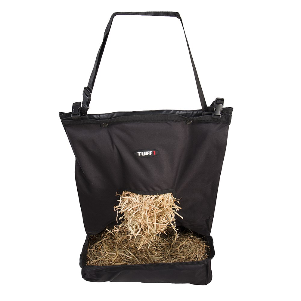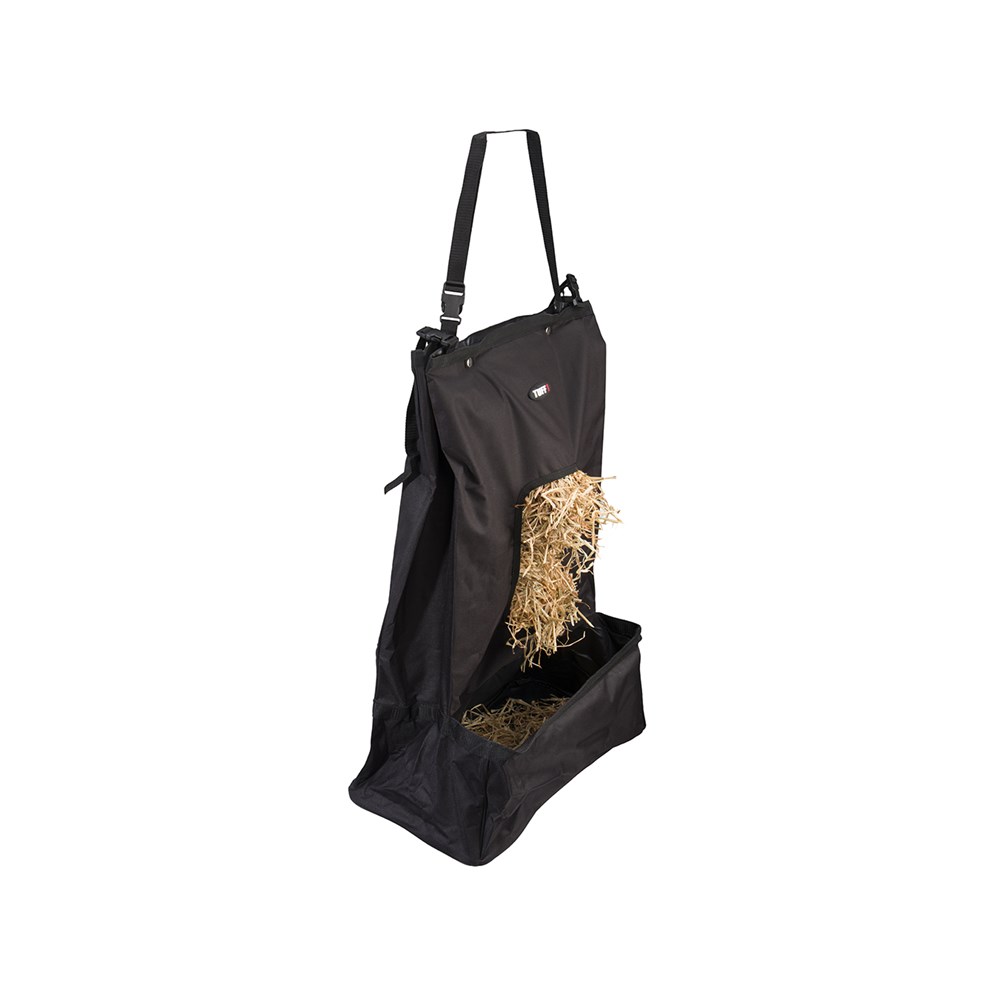 Features adjustable straps at the top for hanging or convenient carrying, a large opening at the front for easy access of hay, and a large grain trough at the bottom.