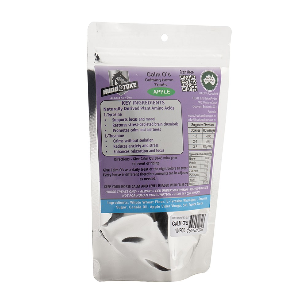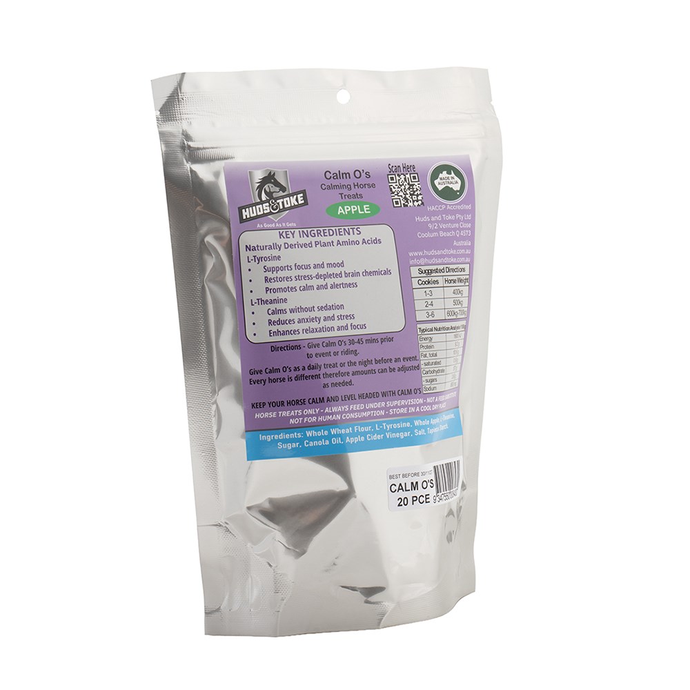 Discover Huds & Toke Calm O's Calming Horse Treats, premium Australian made baked cookies formulated to support a calm, confident and focused horse during training, travel or competition. These functional treats feature naturally derived plant amino acids L-Tyrosine and L-Theanine to help reduce anxiety and stress without sedation, promoting relaxation while maintaining alertness. Available in convenient 3, 10 and 20 piece packs, these low sugar horse treats are ideal as a pre-event aid or everyday reward to support mood, focus and overall wellbeing.