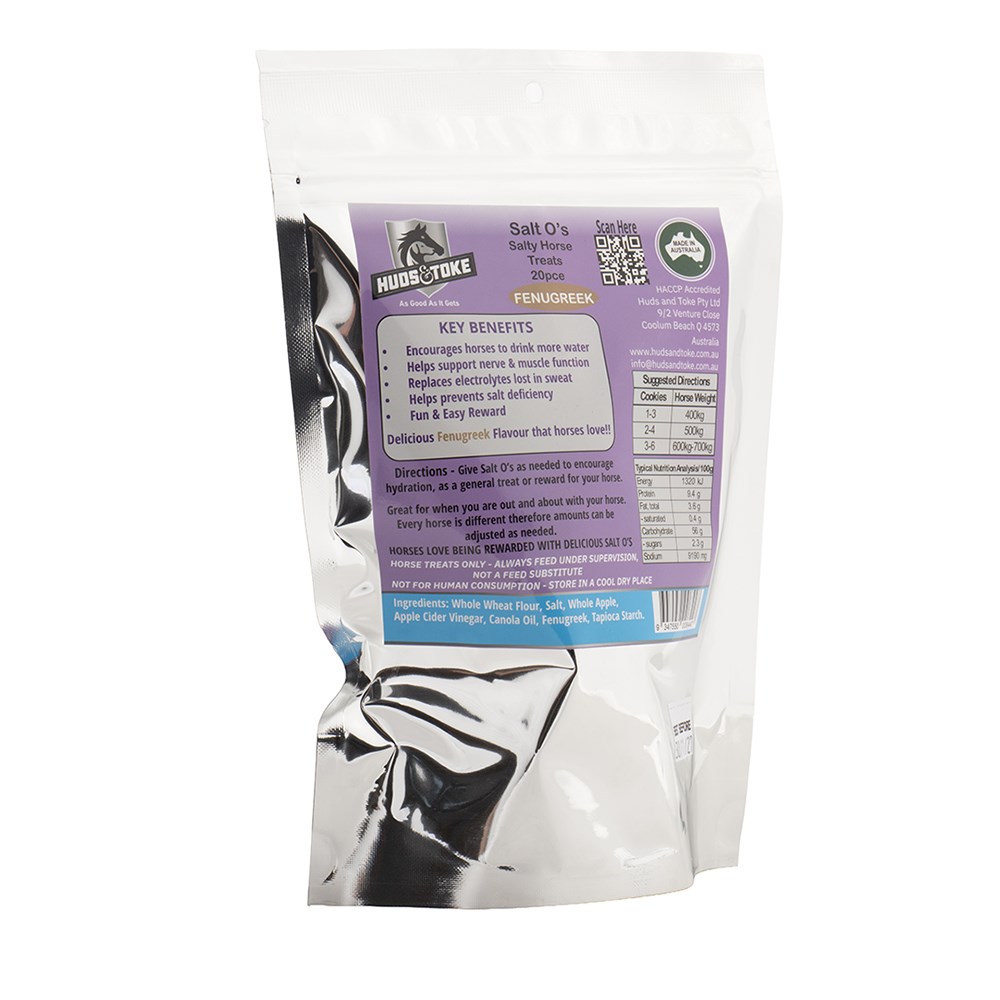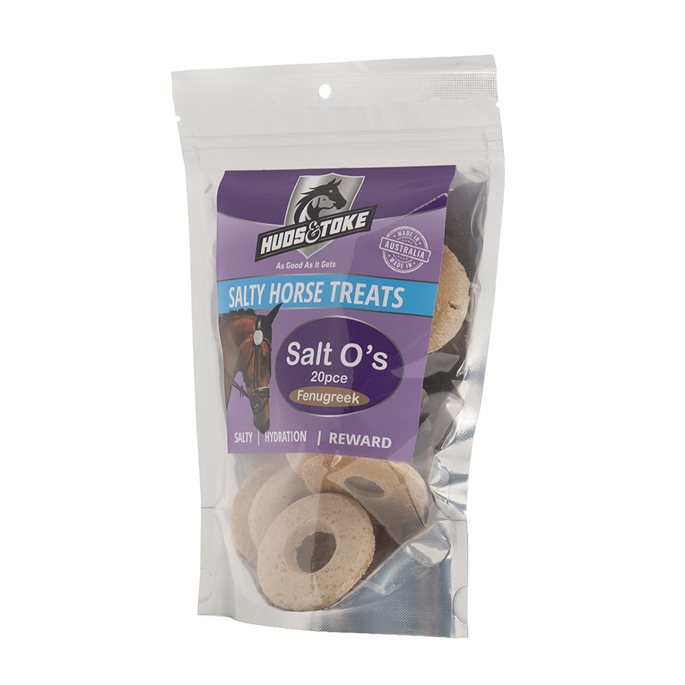 Discover Huds & Toke Salt O's, naturally baked salty horse treats crafted in Australia to support everyday health and hydration. These crunchy O-shaped snacks combine quality Australian ingredients with a delicious hint of fenugreek that horses find highly palatable, making them ideal as a functional reward after work or training.